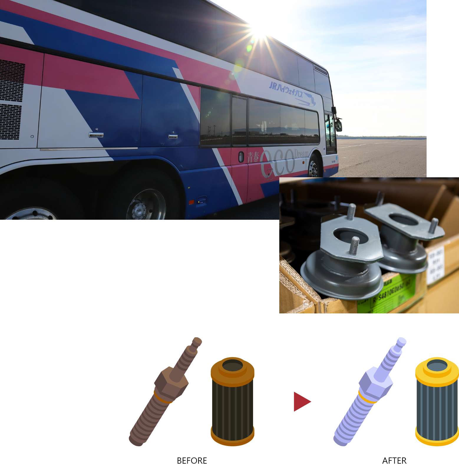 弊社では、バス車両などに使用されているエアースプリング(ベローズ)やブレーキシューなどの部品を「リビルト(再生)」し、販売しています。